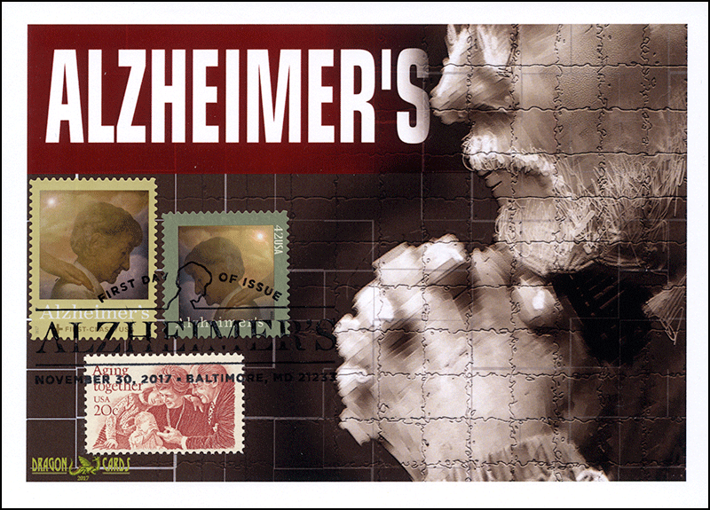 Sc. TBA Alzheimer's Disease Semipostal on a 5"x7" Dragon Card with the same design as Dgn 314: a graphic of an elderly man. With Sc. 2011 Aging Together and the 2008 Alzheimer's commemorative, Sc. 4358, which has a similar design. First Day of Issue pictorial hand cancel. Great for a social issues-, health- or aging-on-stamps collection!