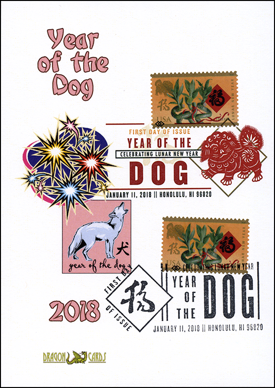 ![]() | ![]() First Day Cover Year of the Dog Dgn 634a $4.50 Sc. 5254 Year of the Dog on a 5"x7" Dragon Card showing a Year of the Dog icon and fireworks. Vertical format, with one U.S. stamp canceled with the Digital Color Postmark and a second U.S. stamp canceled with the pictorial first-day postmark. Great for a lunar new year-, holidays-, or dogs-on-stamps collection! |
