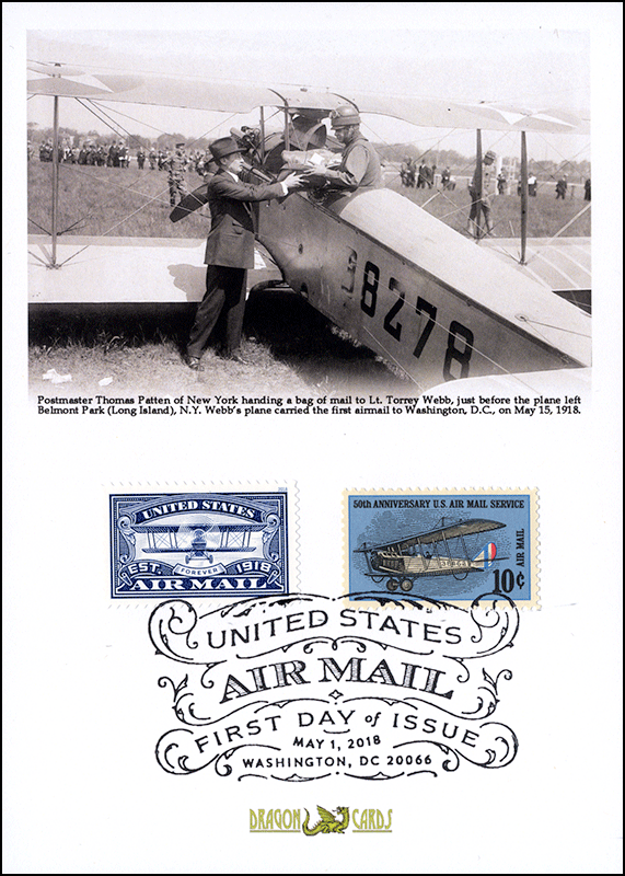 ![]() | ![]() First Day Cover Airmail Centennial I Dgn 645 $3.00 Sc. TBA Airmail Centennial I on a 5"x7" Dragon Card reproducing a photo of the NYC postmaster handing mail to a pilot before the first scheduled airmail flight to Washington. The text is in black. The new stamp and Sc. C74 50th anniversary of airmail are tied by the B&W pictorial first-day cancel. Great for a postal services-, airmail-, aviation- or airplanes-on-stamps collection! |
