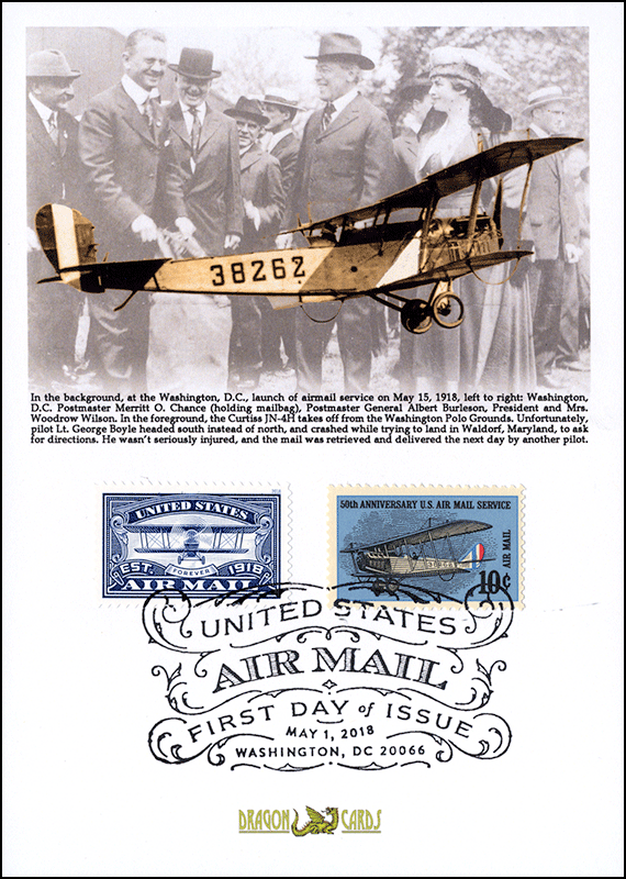 ![]() | ![]() First Day Cover Airmail Centennial I Dgn 648 $3.00 Sc. TBA Airmail Centennial I on a 5"x7" Dragon Card reproducing a photo of dignitaries in Washington, including President Wilson, before the first schedule airmail flight to New York. The text is in black. The new stamp and Sc. C74 50th anniversary of airmail are tied by the B&W pictorial first-day cancel. Great for a postal services-, airmail-, aviation- or airplanes-on-stamps collection! |