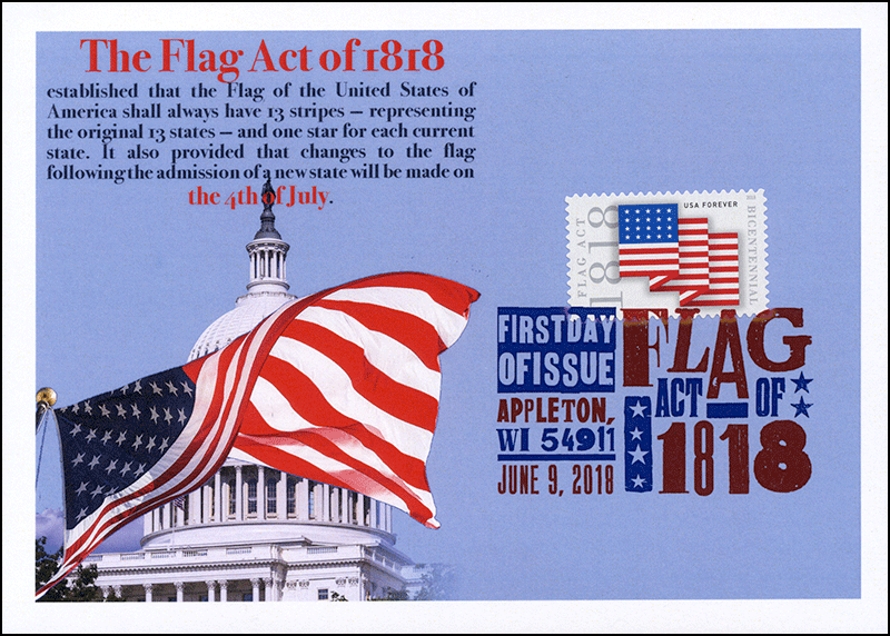 Sc. 5284 Flag Act of 1818 on a 5”x7” Dragon Card showing the modern U.S. flag and the Capitol, representing Congress. The text explains the significance of the Flag Act of 1818. Digital Color Postmark. Great for a flags- or laws-on-stamps collection!