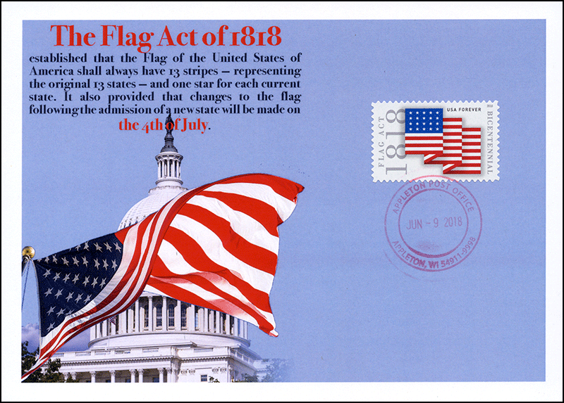 Sc. 5284 Flag Act of 1818 on a 5"x7" Dragon Card showing the modern U.S. flag and the Capitol, representing Congress. The text explains the significance of the Flag Act of 1818. Red registry double-ring cancel, only available on the first-day in Appleton. Great for a flags- or laws-on-stamps collection!