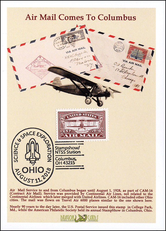 ![]() | ![]() First Day Cover Airmail Centennial II Dgn 654a $2.50 Sc. 5282 Airmail Centennial II on a 5"x7" Dragon Card showing two first flight covers for airmail service from Columbus, Ohio, and a photo of the sort of plane used when that service began on August 1, 1928. APS StampShow/ATA National Topical Stamp Show was being held in Columbus on the first-day for this stamp. The stamp is tied by the show pictorial used on the first day of the stamp. Great for a postal services-, airmail-, aviation- or airplanes-on-stamps collection! |