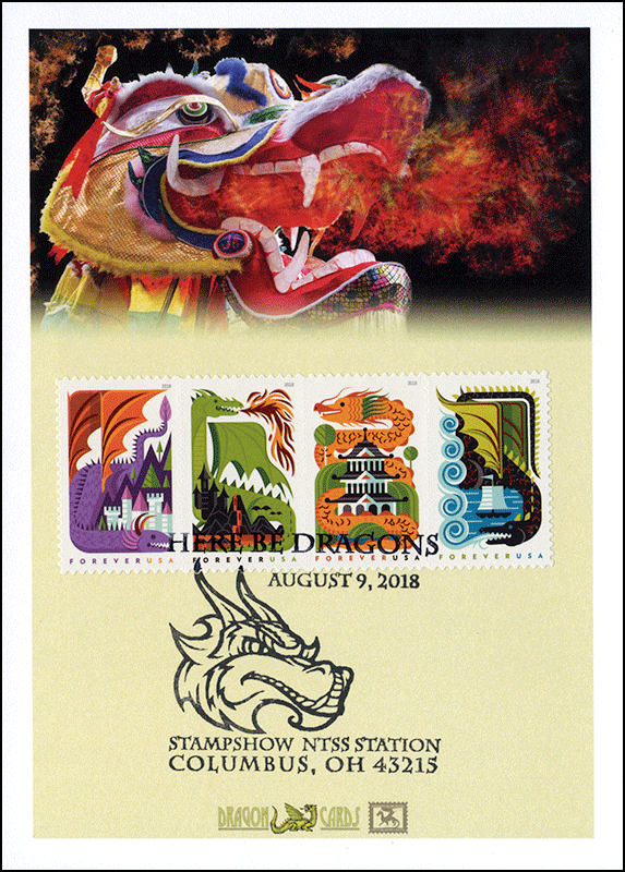 5307-10 Dragons on a 5"x7" Dragon Card reproducing a photo from a lunar new year celebration in Manchester, England. A strip of 4 stamps is affixed. Pictorial APS StampShow/ATA National Topical Stamp Show cancel showing a dragon's head. The stamps were issued at the show. Great for a dragons-, myths- or mythological creatures-on-stamps collection! |
