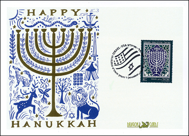 Sc. TBA Hanukkah on a 5"x7" Dragon Card based on a greeting card design. Israel/s first-day pictorial postmark. Great for a Judaica-, Chanukah-, religion- or holidays-on-stamps collection!