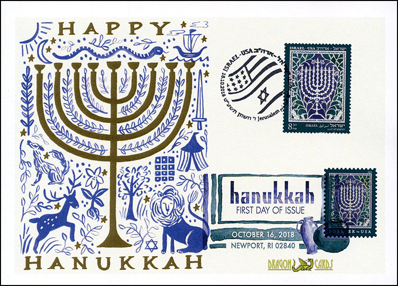 Joint issue! Sc. 5338/TBA Hanukkah on a 5"x7" Dragon Card based on a greeting card design. The Israeli single (no tab) is tied by the Israeli pictorial postmark, the U.S. stamp is tied by its Digital Color Postmark. Great for a Judaica-, Chanukah-, religion- or holidays-on-stamps collection!