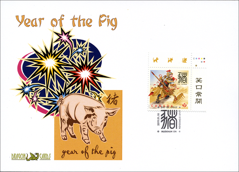 Sc. 3161 Year of the Pig on a 5"x7" Dragon Card showing a Year of the Pig (Boar) icon and fireworks. Corner stamp with selvage of Canada's P-rate and Canada's first-day cancel. Great for a Lunar New Year-, holidays-, pigs-, hogs- or boars-on-stamps collection!