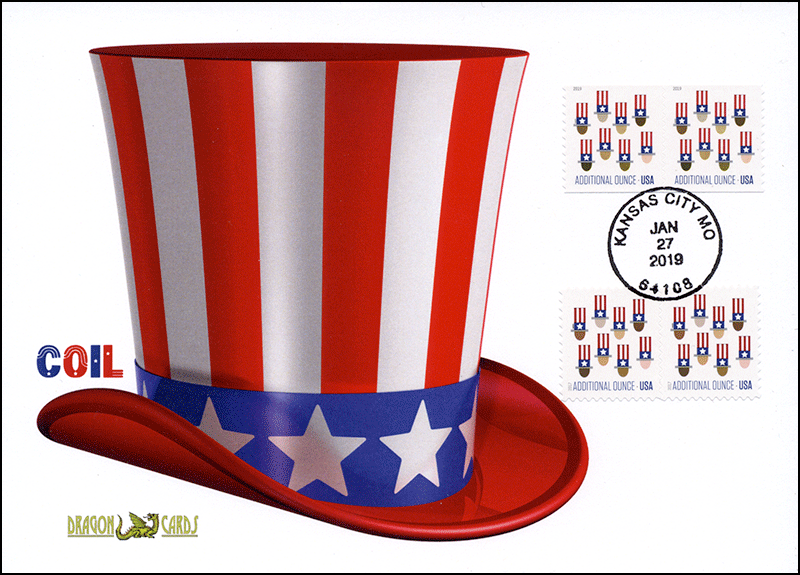 Sc. 5341 Uncle Sam Hat coil on a 5"x7" Dragon Card with printed art of an Uncle Sam Hat. A pair of the new stamp plus a pair of the sheet version of this design (Sc. 5174) are affixed. Circular date stamp (CDS). Great for a patriotism- or whimsy-on-stamps collection!