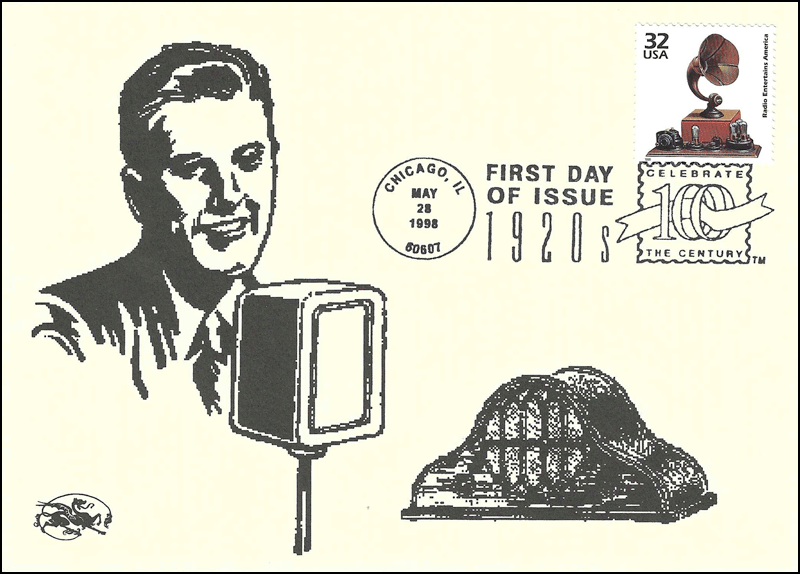 Sc. 3184i Century: Radio single from the Celebrate the Century 1920s sheet on a black-on-cream 5"x7" Dragon Card showing a man singing into 1920s microphone and an early "Cathedral" radio. First Day of Issue hand cancel. Great for a radio- or broadcasting-on-stamps collection!