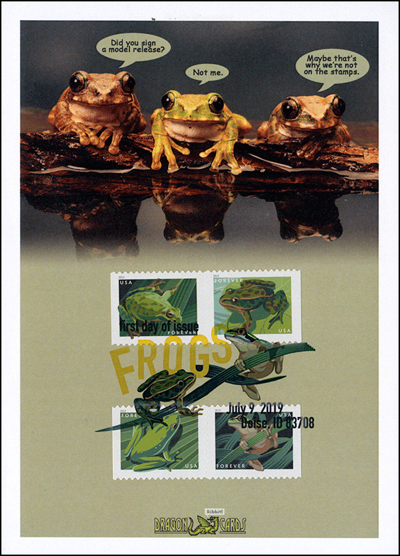 5395-8 Frogs on a 5"x7" Dragon Card reproducing photo of three tree frogs, musing about why their species isn't one of these new frog stamps. All four stamps are affixed, in two horizontal pairs. Digital Color Postmark. Great for a frogs- or amphibians-on-stamps collection! |