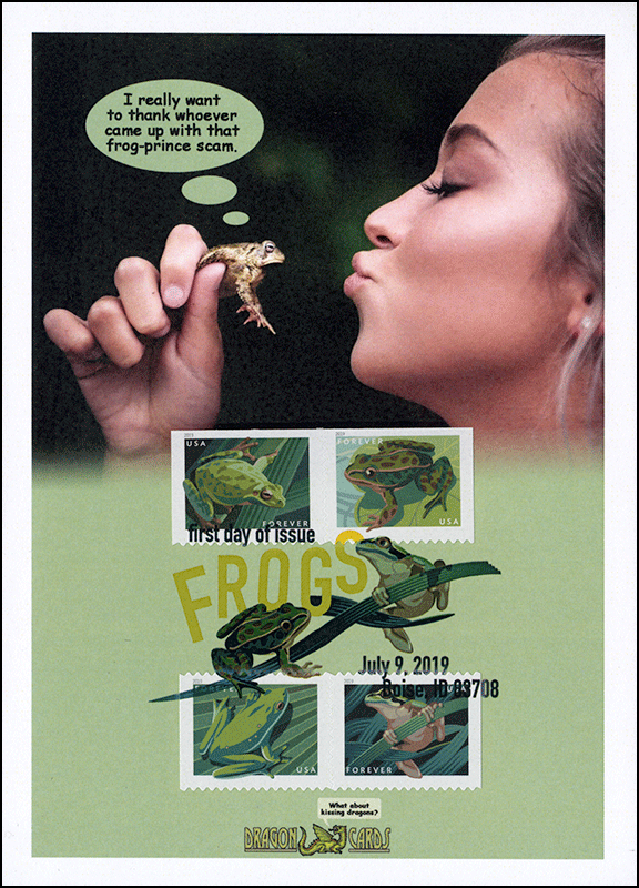 5395-8 Frogs on a 5"x7" Dragon Card reproducing photo of a girl about to kiss a frog. The frog thanks whoever came up with the legend about kissing a frog to find a prince. The dragon in the logo wants equal time for dragons! All four stamps are affixed, in two horizontal pairs. Digital Color Postmark. Great for a frogs- or amphibians-on-stamps collection! |