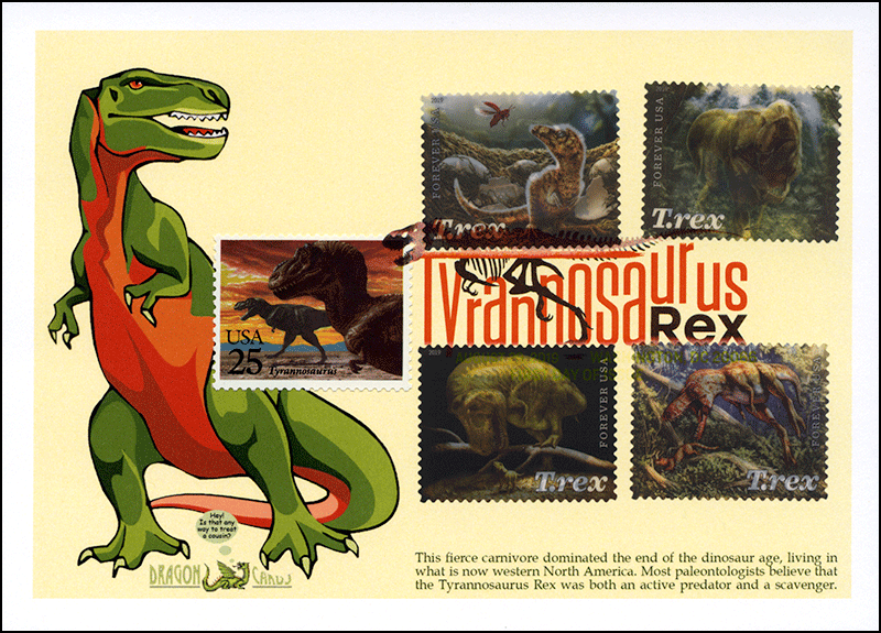Sc. 5410-13 Tyrannosaurus Rex on a 5"x7" Dragon Card with art of an upright T-Rex. The DCP ties the four new stamps with Sc. 2422 Tyrannosaurus Rex from the 1989 Prehistoric Animals set. Great for a dinosaurs-, prehistoric animals- or natural history-on-stamps collection!