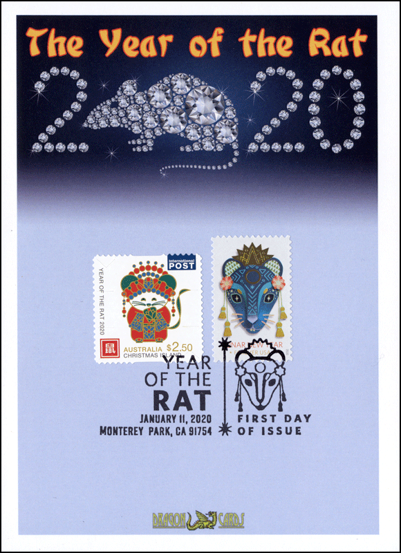 ![]() | ![]() First Day Cover Year of the Rat Dgn 704h $7.00 Sc. 5428 Year of the Rat on a 5"x7" Dragon Card showing artwork of a metal-studded rat. (This is a "metal" year.) The U.S. and Christmas Islands Australia stamps are tied by the U.S. pictorial first-day cancel. Great for a Lunar New Year-, holidays-, rats- or mice-on-stamps collection! |