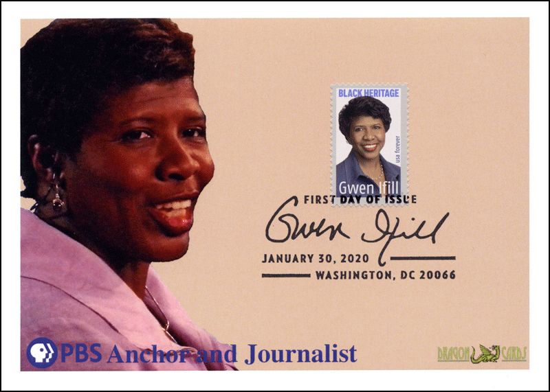 Sc. TBA Gwen Ifill on a 5"x7" Dragon Card showing her at the 2012 Republican National Convention. Pictorial Postmark. Great for a Black History-, women- or journalism-on-stamps collection!