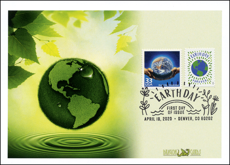 Sc. TBA Earth Day on a 5"x7" Dragon Card featuring art of the Earth over a pool of water. The pictorial postmark ties the new stamp and Sc. 3189a Earth Day Celebrated from the Celebrate the Century series. Great for an environment-on-stamps collection!