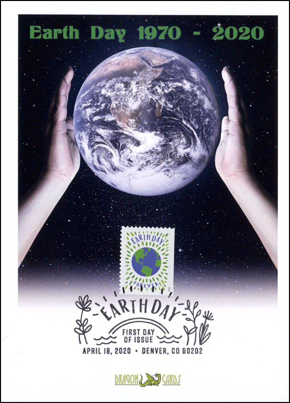 ![]() | ![]() First Day Cover Earth Day Dgn 718a $3.00 Sc. TBA Earth Day on a 5"x7" Dragon Card featuring a photo montage of a pair of hands holding the planet Earth, as seen from space. B&W pictorial postmark. Great for an environment-on-stamps collection! |