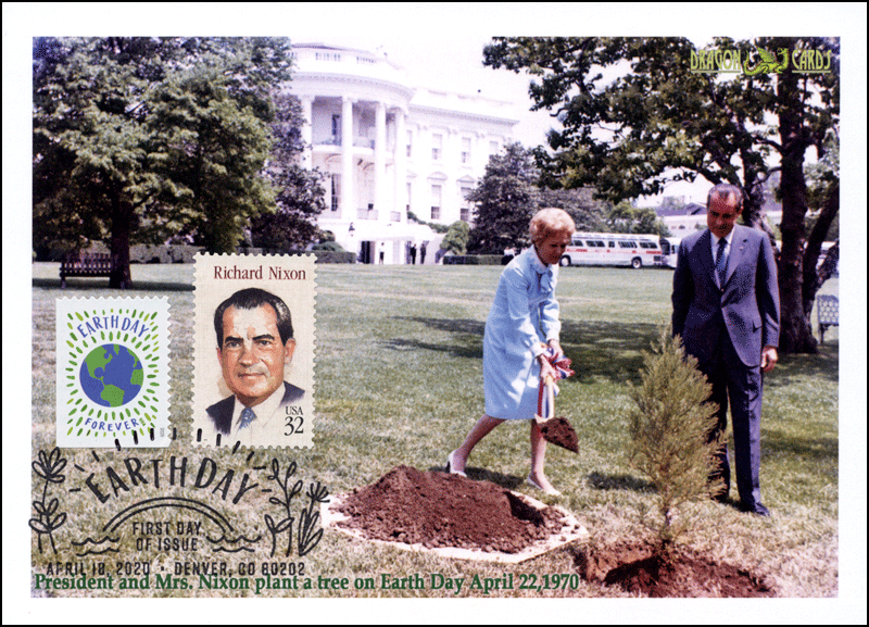 Sc. TBA Earth Day on a 5"x7" Dragon Card reproducing a photo of President & Mrs. Nixon planting a tree on the White House lawn on the first Earth Day in 1970. The pictorial postmark ties the new stamp and Sc. 2955 Nixon. Great for an environment-on-stamps collection!