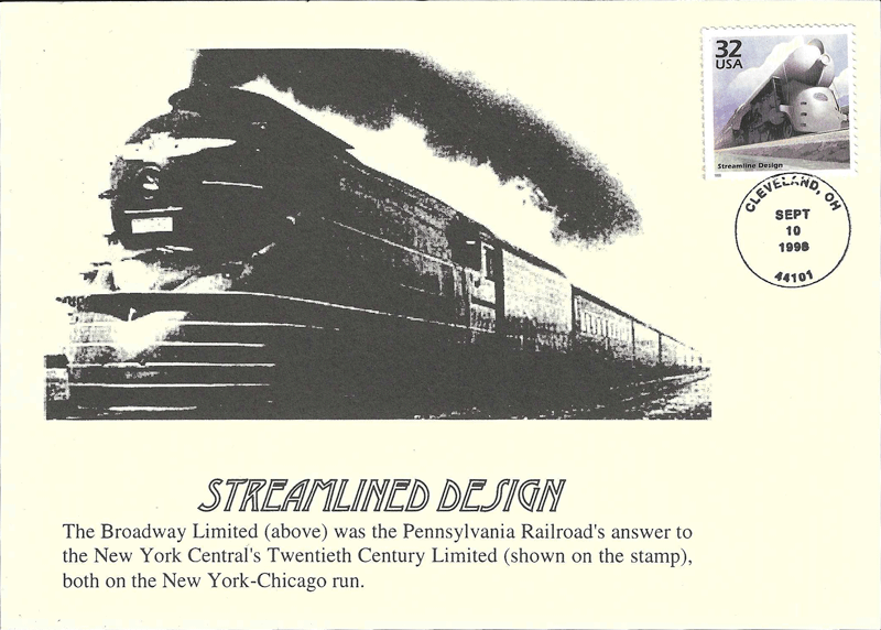 Sc. 3185k Century: Streamlined Design single from the Celebrate the Century 1930s sheet on a black-on-cream 5"x7" Dragon Card, printed photo of the Pennsylvania Railroad's "Broadway Limited" streamliner (the stamp shows NY Central's rival New York-Chicago 20th Century Limited). First Day of Issue hand cancel. Great for a railroads, trains, streamlined design, streamliner-on-stamps collection!