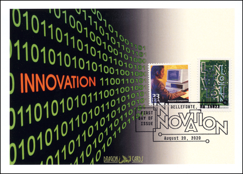 Sc. 5514 Innovation-Computing on a 5"x7" Dragon Card featuring a graphic representation of computer data. The Computing stamp and Sc. 3190n Personal Computers from Celebrate the Century 1980s are tied by the Pictorial Postmark. Great for a technology-, computing- or science-on-stamps collection!