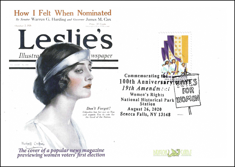 Sc. 5523 19th Amendment on a 5"x7" Dragon Card reproducing the front cover of Leslie's Illustrated news magazine of October 2, 1920, previewing the first election in which women could vote. Women's Rights National Historic Park pictorial postmark for August 26, 2020, the centennial of the certification of the adoption of the 19the Amendment. Not a first-day (4 days later). The postmark is not perfect: "ment" in "Amendment" is under-inked.