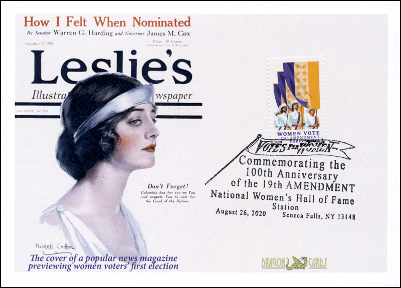 Sc. 5523 19th Amendment on a 5"x7" Dragon Card reproducing the front cover of Leslie’s Illustrated news magazine of October 2, 1920, previewing the first election in which women could vote. National Women's Hall of Fame pictorial postmark for August 26, 2020, the centennial of the certification of the adoption of the 19the Amendment. Not a first-day (4 days later). Great for a women-, politics- or civil rights-on-stamps collection!