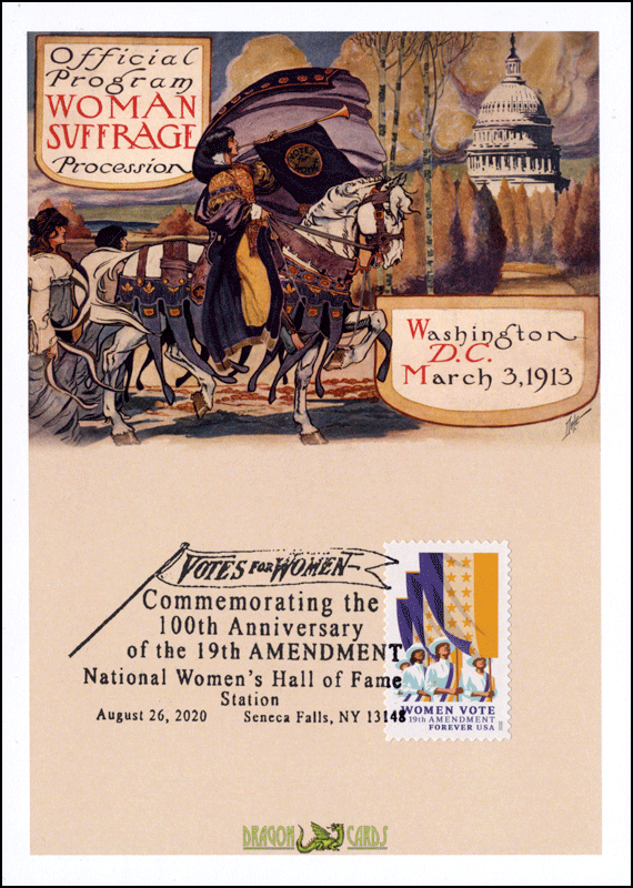 ![]() | ![]() First Day Cover 19th Amendment Dgn 730d $3.50 Sc. 5523 19th Amendment on a 5"x7" Dragon Card reproducing the official program for the Woman Suffrage Procession in Washington, D.C., March 3, 1913. National Women's Hall of Fame pictorial postmark for August 26, 2020, the centennial of the certification of the adoption of the 19the Amendment. Not a first-day (4 days later). Great for a women-, politics- or civil rights-on-stamps collection! |