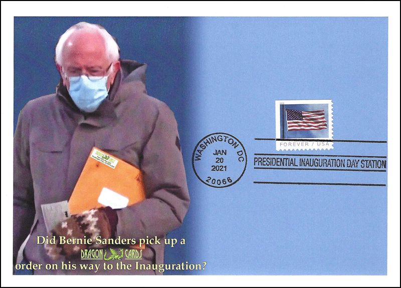 Sc. N/A Inauguration on a 5"x7" Dragon Card featuring a photo of Vermont Sen. Bernie Sanders arriving at inauguration ceremony, holding a large envelope — and it appears to have a Dragon Cards return address on it! The inaugural 4-bar cancel ties a Sc. 5344 Flag stamp. Great for a presidents-, Americana- or humor-on-stamps collection!