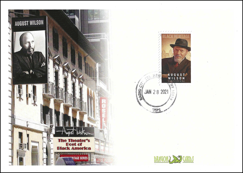 Sc. 5555 August Wilson on a 5"x7" Dragon Card featuring the August Wilson Theatre in New York. The computer art was based on a 2007 photo of the theater. Radio City NYC black dater cancel. This post office is about a block from the August Wilson Theatre. Great for a black history-, theater-, and entertainment-on-stamps collection!