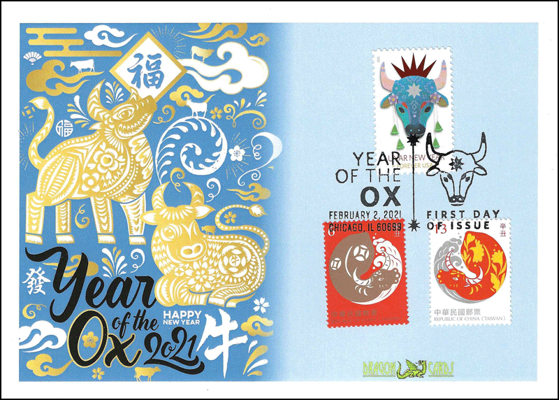 Sc. 5556 Year of the Ox on a 5"x7" Dragon Card featuring Asian-style iconography. The U.S. stamp and Taiwan's singles are tied by the U.S. pictorial first-day postmark. Great for a Lunar New Year-, holidays-, oxen-, bullocks-, cattle- or animals-on-stamps collection!