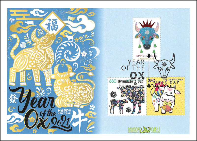 Sc. 5556 Year of the Ox on a 5"x7" Dragon Card featuring Asian-style iconography. The U.S. stamp and South Korea's singles are tied by the U.S. pictorial first-day postmark. Great for a Lunar New Year-, holidays-, oxen-, bullocks-, cattle- or animals-on-stamps collection!