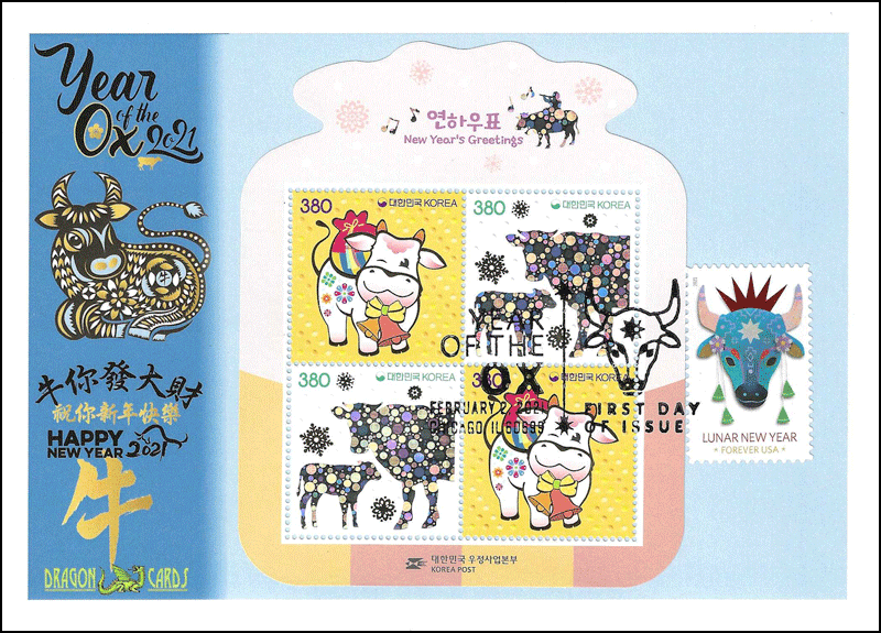 Sc. 5556 Year of the Ox on a 5"x7" Dragon Card featuring Asian-style iconography, in a narrow design for souvenir sheet combos. The U.S. stamp and the South Korean souvenir sheet are tied by the U.S. pictorial first-day postmark. Great for a Lunar New Year-, holidays-, oxen-, bullocks-, cattle- or animals-on-stamps collection!
