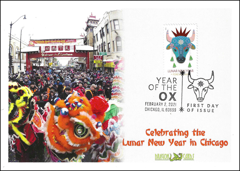 Sc. 5556 Year of the Ox on a 5"x7" Dragon Card featuring a photo of an earlier Lunar New Year parade in Chicago, the first-day city. Pictorial first-day postmark. Great for a Lunar New Year-, holidays-, oxen-, bullocks-, cattle- or animals-on-stamps collection!