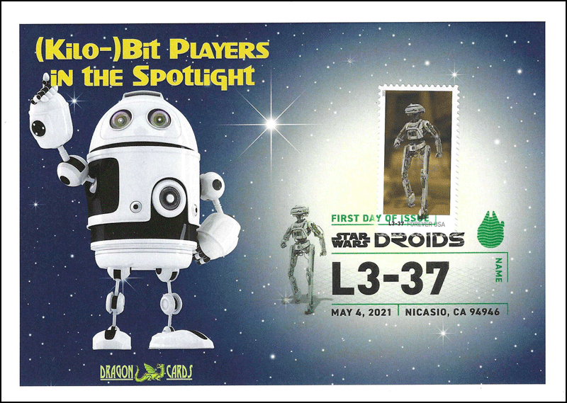 Sc. 5577 Star Wars Droids L3-37 on a 5"x7" Dragon Cards showing a generic droid and the headline "(Kilo-)Bit Players In The Spotlight." The stamp is tied by the matching Digital Color Postmark. Great for a Star War-, movies-, films-, SF- or Science Fiction-on-stamps collection!