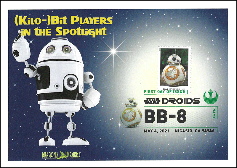 Sc. 5578 Star Wars Droids BB-8 on a 5"x7" Dragon Cards showing a generic droid and the headline "(Kilo-)Bit Players In The Spotlight." The stamp is tied by the matching Digital Color Postmark. Great for a Star War-, movies-, films-, SF- or Science Fiction-on-stamps collection!
