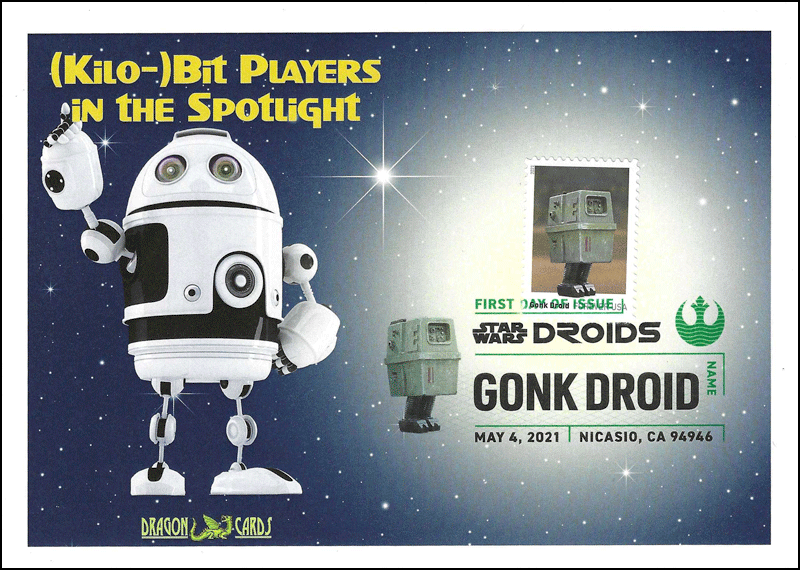 Sc. 5580 Star Wars Droids Gonk on a 5"x7" Dragon Cards showing a generic droid and the headline "(Kilo-)Bit Players In The Spotlight." The stamp is tied by the matching Digital Color Postmark. Great for a Star War-, movies-, films-, SF- or Science Fiction-on-stamps collection!