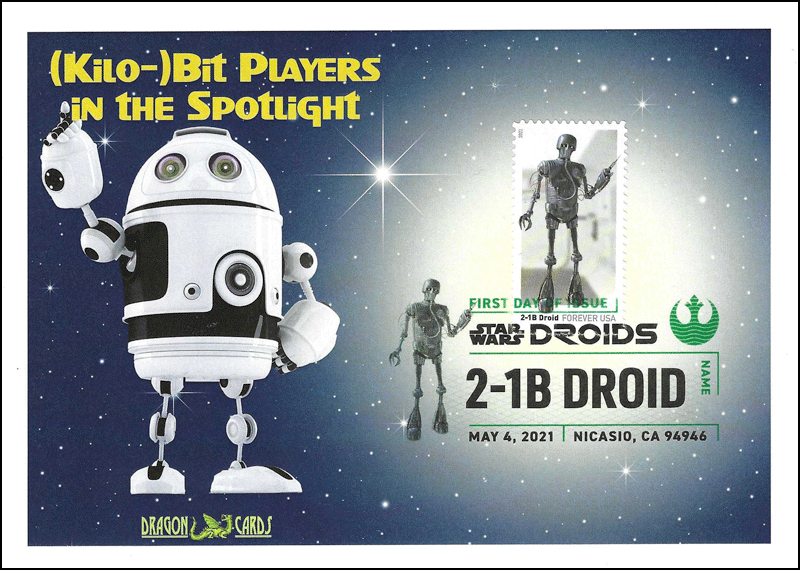 Sc. 5581 Star Wars Droids 2-1B on a 5"x7" Dragon Cards showing a generic droid and the headline "(Kilo-)Bit Players In The Spotlight." The stamp is tied by the matching Digital Color Postmark. Great for a Star War-, movies-, films-, SF- or Science Fiction-on-stamps collection!