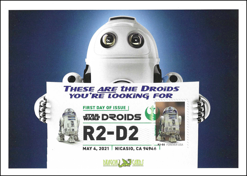 Sc. 5574 Star Wars Droids on a 5"x7" Dragon Cards showing a droid holding a placard, on which is "These are the Droids you're looking for." The R2-D2 stamp is below, tied by its specific Digital Color Postmark. Great for a Star War-, movies-, films-, SF- or Science Fiction-on-stamps collection!