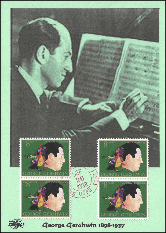 ![]() First Day Cover Gershwin Centennial Dgn 75 $5.00 Sc. N/A Gershwin Centennial on a A black-on-green 5"x7" Dragon Card reproducing a photo of him composing at the piano. Two vertical pairs of Sc. 1484, the 1973 Gershwin stamp, are tied by the red registry hand cancel in Brooklyn on September 26, 1998, the centennial of his birth. This is not a first-day. Great for a music-, theater- or Judaica-on-stamps collection! |