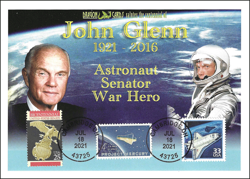Sc. N/A John Glenn on a 5"x7" Dragon Card showing official photos of John Glenn as a U.S. Senator and a Project Mercury astronaut. The background is a photo he took from orbit during his historic 1962 flight. Two round July 18, 2021, Cambridge OH postmarks (the centennial and place of his birth) tie stamps representing his life: Senate (Sc. 2413), Project Mercury (1193, issued the day Glenn became the first American to orbit the Earth) and Return to Space (3191h), from the Celebrate the Century 1990s sheet. In 1998, at age 77, he became the oldest person to fly into space up to that point, as part of a shuttle crew. As a Marine fighter pilot in World War II and the Korean War, he was decorated numerous times. Great for a space-, military-, government- or Americana-on-stamps collection!