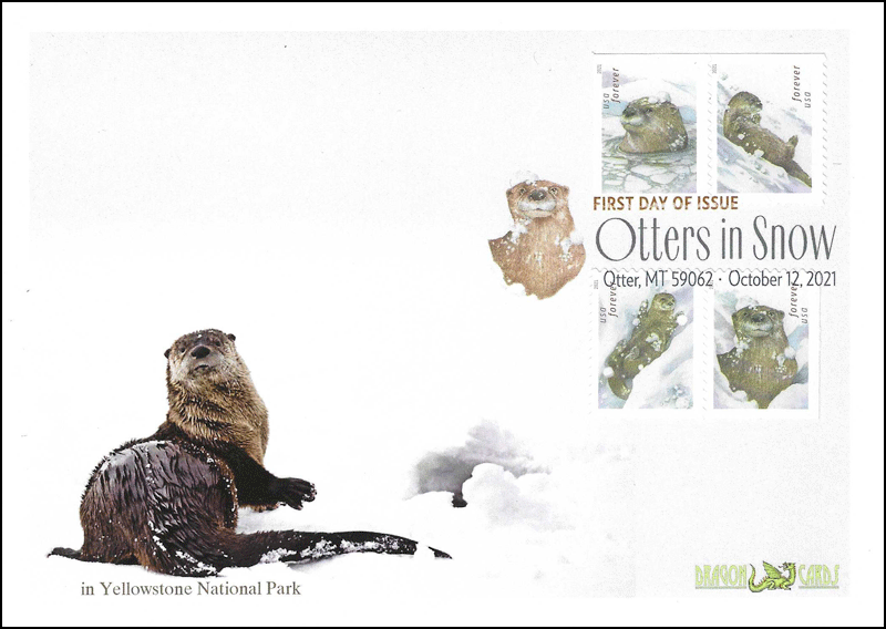 Sc. 5648-51 Otters in Snow on a 5"x7" Dragon Card reproducing a photo of an otter playing in the snow in the Montana portion of Yellowstone National Park. Two pairs ot stamps are tied by the Digital Color Postmark between them. Great for an animals-, wildlife- or mammals-on-stamps collection!