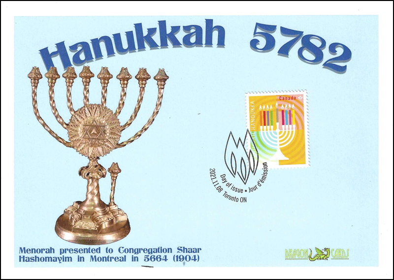 Sc. 3313 Hanukkah on a 5"x7" Dragon Card reproducing a photo of a menorah presented to Congregation Shaar Hashomayim in Montreal in 1904. First Day of Issue postmark. Great for a Judaica-, Chanukah-, religion- or holidays-on-stamps collection!