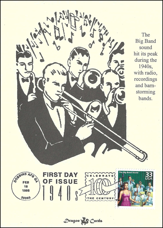 ![]() First Day Cover Century: Big Bands Dgn 77 $3.00 Sc. 3186j Century: Big Bands single from the Celebrate the Century 1940s sheet on a black-on-cream 5"x7" Dragon Card, showing tuxedoed jazz musicians led by trombonist. First Day of Issue hand cancel. Great for a music-, jazz-, or swing-on-stamps collection! |