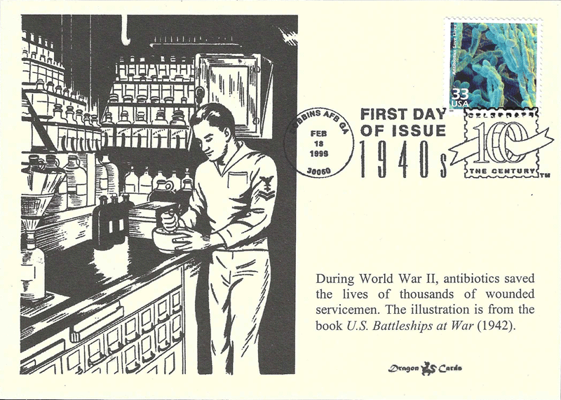 ![]() First Day Cover Century: Antibiotics Dgn 78 $3.00 Sc. 3186b Century: Antibiotics single from the Celebrate the Century 1940s sheet on a black-on-cream 5"x7" Dragon Card, drawing from 1942 book of a navy pharmacist's mate aboard battleship, First Day of Issue hand cancel. Great for a medicine- or pharmacy-on-stamps collection! |