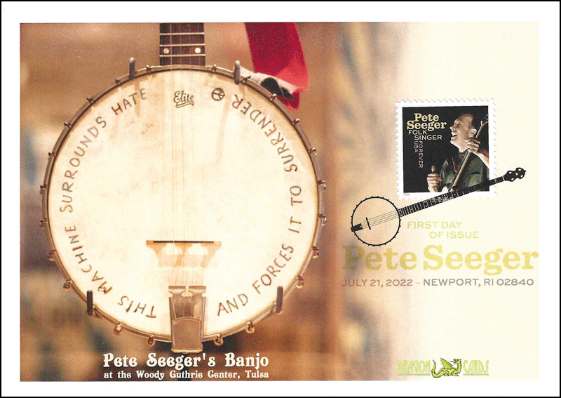 Sc. 5708 Pete Seeger on a 5"x7" Dragon Card showing his banjo on display at the woody Guthrie Center. Digital Color Postmark. Great for a music- or Americana-on-stamps collection! Back To