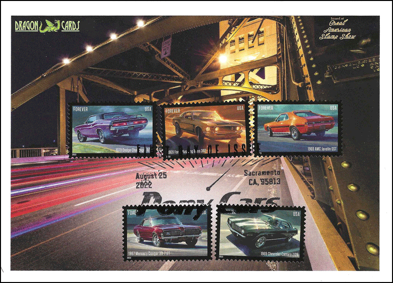 Sc. 5715-9 Pony Cars on a 5"x7" Dragon featuring a photo of the Tower Bridge, a Sacramento landmark, at night. (The stamps were issued in Sacramento.) The five stamps are tied by the B&W pictorial first-day postmark. Great for a cars-, autos- or transportation-on-stamps collection!