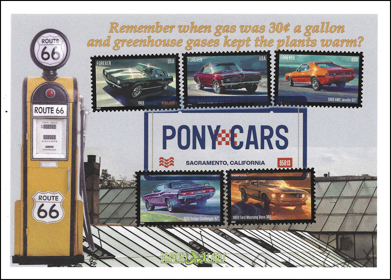 Sc. 5715-9 Pony Cars on a 5"x7" Dragon Card featuring photos of an early 1960s gas pump and a greenhouse. The text asks, "Remember when gas was 30¢ a gallon and greenhouse gases kept the plants warm?" The five stamps are tied by the Digital Color Postmark. Great for a cars-, autos- or transportation-on-stamps collection!