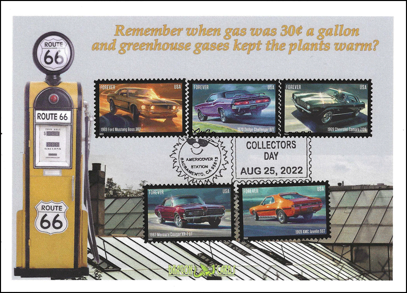 Sc. 5715-9 Pony Cars on a 5"x7" Dragon Card featuring photos of an early 1960s gas pump and a greenhouse. The text asks, "Remember when gas was 30¢ a gallon and greenhouse gases kept the plants warm?" The five stamps are tied by the Americover 2022 Collectors Day show pictorial (first-day date), which was not actually available at the show. Great for a cars-, autos- or transportation-on-stamps collection!