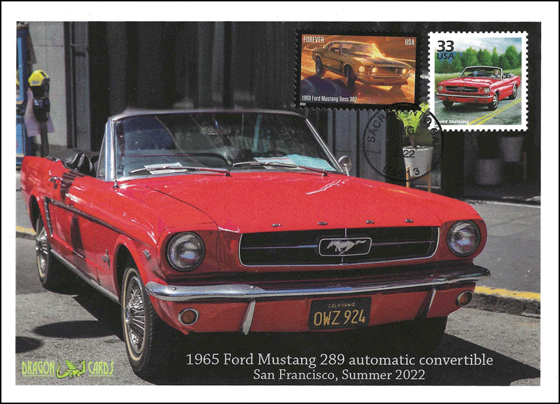 Sc. 5715 Pony Cars - Mustang on a 5"x7" Dragon Card featuring a photo of a mint-condition 1965 Ford Mustang convertible parked in downtown San Francisco in July 2022. The 1969 Ford Mustang Boss 302 stamp and the Ford Mustang stamp from the Celebrate the Century 1960s sheet are tied by the circular date stamp (first day) of Pony Cars. Great for a cars-, autos- or transportation-on-stamps collection!