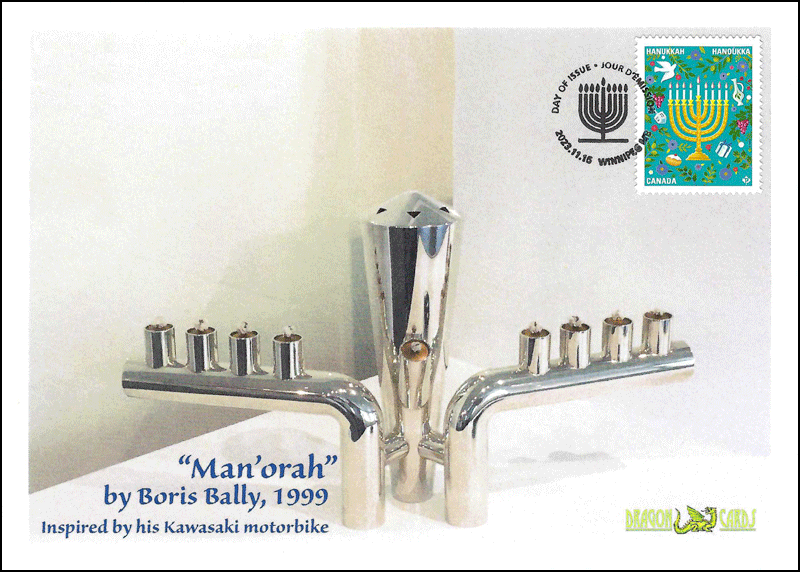 Sc. 5739 Hanukkah on a 5"x7" Dragon Card showing Boris Bally's 1999 sculpture, "Man'orah," a menorah inspired by the artist's Kawasaki motorbike. It is on display at Boston's Museum of Fine Arts. This was produced for the 2022 U.S. and Canadian Hanukkah stamps. Four were serviced with the 2023 Canadian stamp and its first-day postmark. Great for a Judaica-, Chanukah-, religion- or holidays-on-stamps collection!