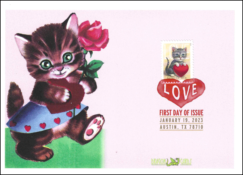 Sc. 5745 Love/Kitten on a 5"x7" Dragon Card featuring old-style Valentine art of an anthropomorphic kitten with a flower and a heart-shaped box of candy. Digital Color Postmark. Great for a love-, kittens-, cats- or pets-on-stamps collection!